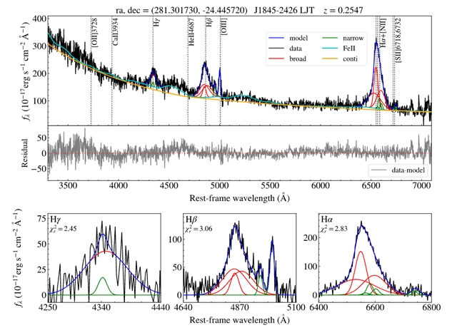 团队以具有VVV/VVVX时域巡天的近红外观测数据为先决条件,对3颗高光变类星体开展了光学、近红外和中红外的时延分析。基于该时延测量结果和尘埃粒子的典型升华温度,团队通过石墨和硅酸盐升华半径的理论公式,推算出尘埃环中石墨与硅酸盐颗粒的尺寸比约为0.4。结果表明,在尘埃环中,小尺寸的石墨颗粒主导了近红外波段辐射,较大尺寸的硅酸盐颗粒则主要贡献于中红外辐射。同时,团队对样本中最亮的类星体VVV J1845-2426展开了详细分析,并结合丽江2.4米光学望远镜的光谱观测数据,测得该类星体的红移约为z=0.25,且估算出其中心黑洞质量约为log10(MBH/Msun)=8.6±0.1。团队进一步通过多波段光谱能量分布拟合,在该源中发现了极性尘埃的存在迹象。