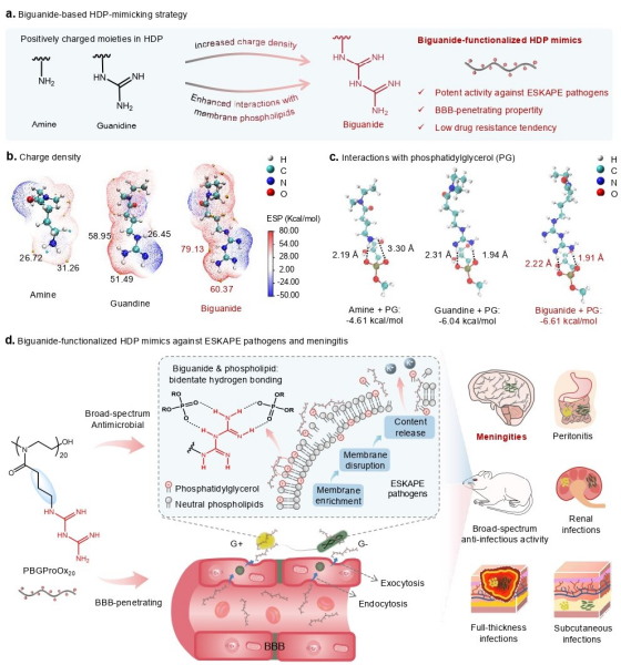 基于此策略设计的双胍化多肽模拟物在皮肤伤口感染、皮下感染、肾脏感染和腹膜炎等多种动物感染模型中均展现出优异的治疗效果。更重要的是,双胍化多肽模拟物能够通过转胞吞穿透血脑屏障,有效治疗耐药细菌性脑膜炎。该研究为设计兼具高效抗ESKAPE活性和穿透血脑屏障性能的HDP模拟物提供了创新策略,对于包括脑膜炎在内的ESKAPE感染治疗具有重要意义。