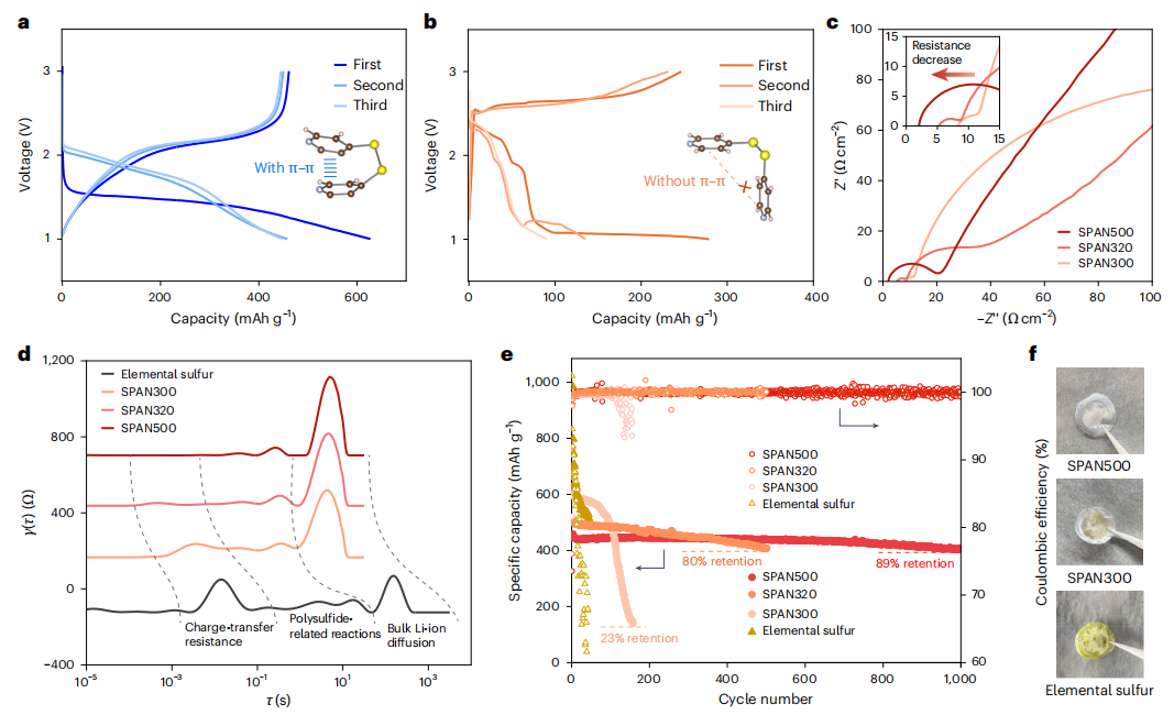进一步研究表明,仅有S–C键并不足以保证硫反应的可逆性。吡啶骨架之间的π–π堆叠为电子提供了连续传输通道,有助于稳定硫中心自由基并降低电荷转移阻抗;而短链硫结构则显著抑制了多硫化物溶解,改善了循环稳定性。在优化条件下制备的SPAN正极在超过1000次循环后仍保持接近90%的容量保持率。
