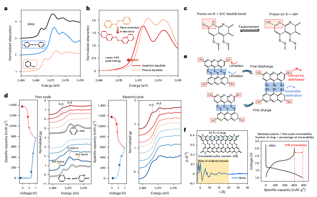 硫K边原位XAS进一步揭示,SPAN首圈不可逆容量损失主要来源于残余质子引发的硫醇–硫酮互变结构。在首次放电过程中,锂离子取代这些质子并被不可逆地束缚在结构边缘位点,导致约20%的活性硫无法参与后续循环。通过扩大吡啶有序结构尺寸、降低–NH基团含量,可有效缓解这一问题。