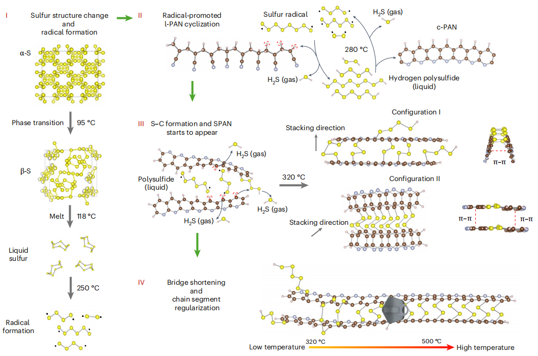 原位PDF实验显示,SPAN的形成可清晰划分为四个连续阶段:(1)硫在升温过程中发生相变并熔融,产生高活性的硫自由基;(2)硫自由基抽取聚丙烯腈(PAN)主链上的氢原子,诱导线性PAN向环化PAN(c-PAN)转变;(3)硫与c-PAN形成稳定的S–C共价键,抑制PAN主链进一步二维融合,同时诱导吡啶骨架之间形成π–π堆叠结构;(4)在更高温度下,长链硫逐步转化为短链硫桥,结构发生类似“拉链”的收缩与致密化。
